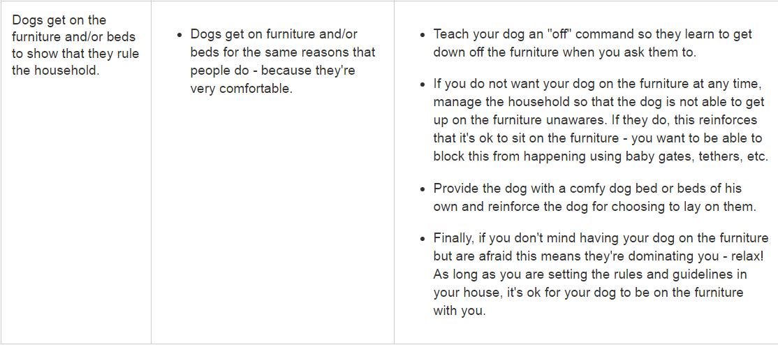 The myths that resonate in "dominance theory," such as not allowing the dog to sleep on the bed, or eat first, or go through doorways first, have no bearing on whether or not the dog will look to the owner for guidance. The specific rules of the relationship are up to the owner and are based on what they want in their household. Humane, educated trainers should strive to teach owners to positively and gently influence and motivate their dogs to act in a manner that befits their own home and tailor the "rules" to each individual. There is no scientifically validated data to uphold the belief that you must eat before your dog, or keep them from sleeping on your bed, or walking in front of you, and owners should not be led to believe this and live in a state of fear and anxiety over their dog's possible takeover of their home. In fact, the vast majority of dogs and owners have wonderful, mutually-rewarding relationships - even if the dog is allowed to sleep on the bed, eats alongside the owner, and does many other things erroneously labeled "dominance."